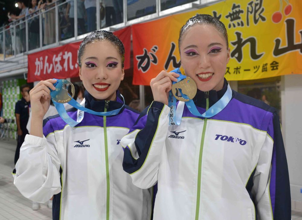 アーティスティックスイミングで優勝した東京の相高花帆(右)と白波瀬菜桜=9月6日