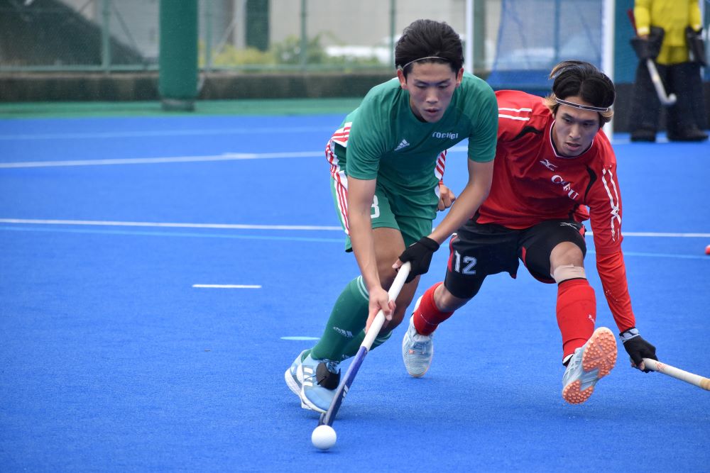 ホッケー成年男子決勝で競り合う岐阜(右)、栃木の両チーム=5日、OSPホッケースタジアム